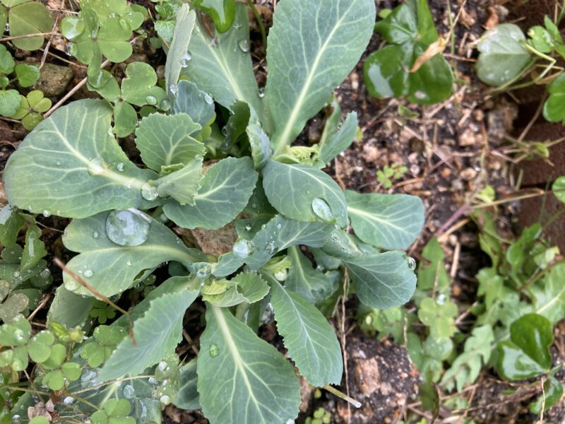 キャベツの芯からわき目が出てきて葉っぱが大きくなってきました。