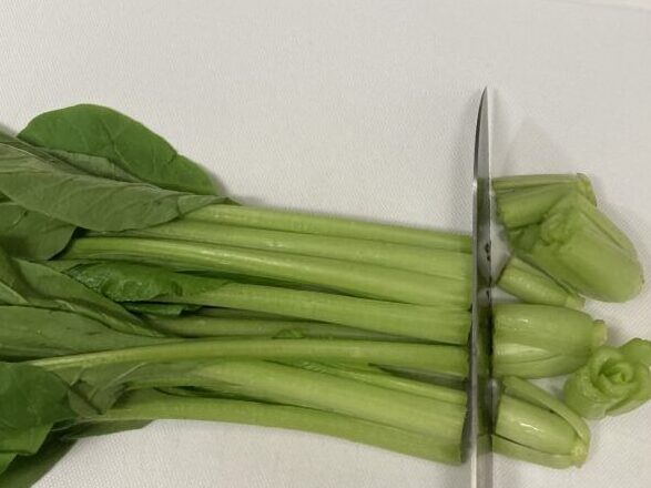 小松菜の根元を2、3センチ残して切ります
